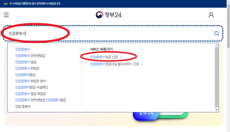 로그인 한 상태에서 인감증명서를 검색창에 입력하면, 인감증명서 발급 신청이 뜹니다.