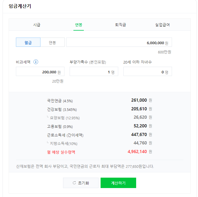 위의 월급은 실제 통장으로 들어오는 급여가 아니라, 흔히들 말하는 원천징수 세전 급여입니다. 따라서 세금, 건강보험 등을 제외하면 통장으로 들어오는 금액은 더 적어지게됩니다. 얼마가 실제로 내 통장에 들어오는 월급인지는 다음의 계산기에서 간편하게 계산이 가능합니다.